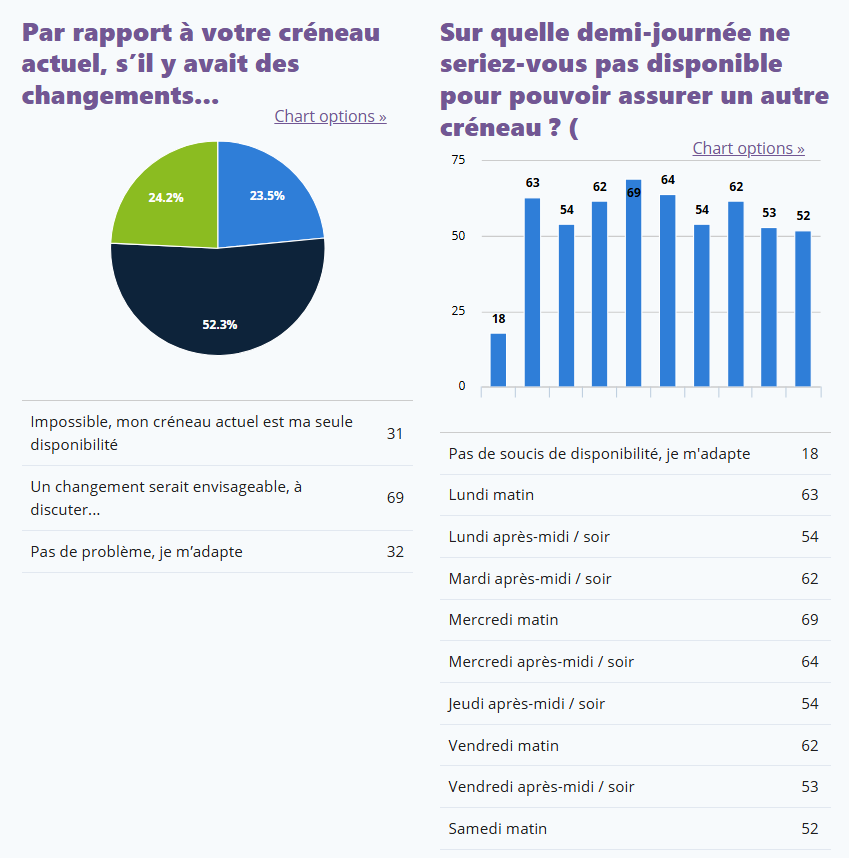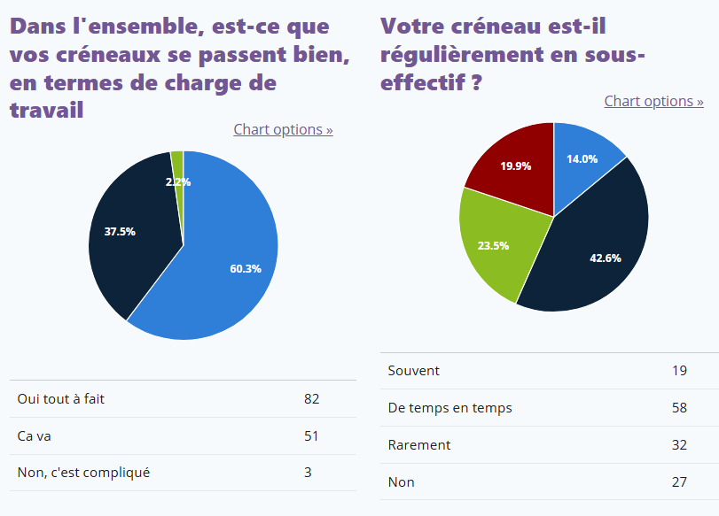 - 98% trouvent que leur créneaux se passent bien en terme d’ambiance et de charge de travail (réponse « oui tout à fait » et « ça va »)