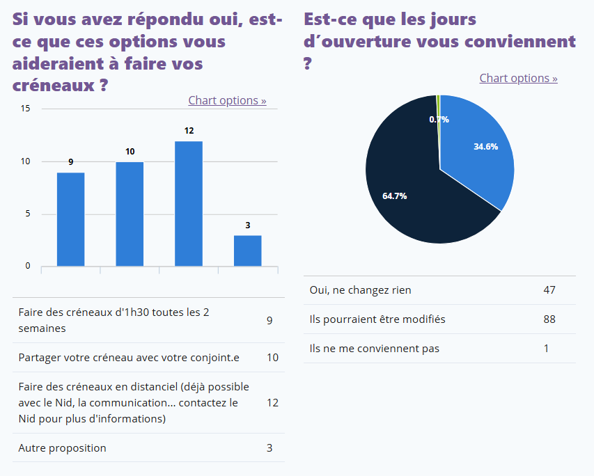 - Je n’ai pas d’avis sur ce qui est le mieux.Par contre, une fermeture le jeudi n’est pas très opportun pour moi. Est-ce que les fourmis qui ne font pas de créneaux accepteraient d’en faire si ceux étaient moins long ? Dans la 1ère option, le Nid, a-t-il la possibilité de décaler son horaire ?
