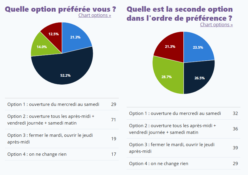 - 298 points pour l’option 2 :ouverture tous les après-midi du lundi au jeudi (mais maintien du créneau de 6h30), + vendredi journée et samedi matin